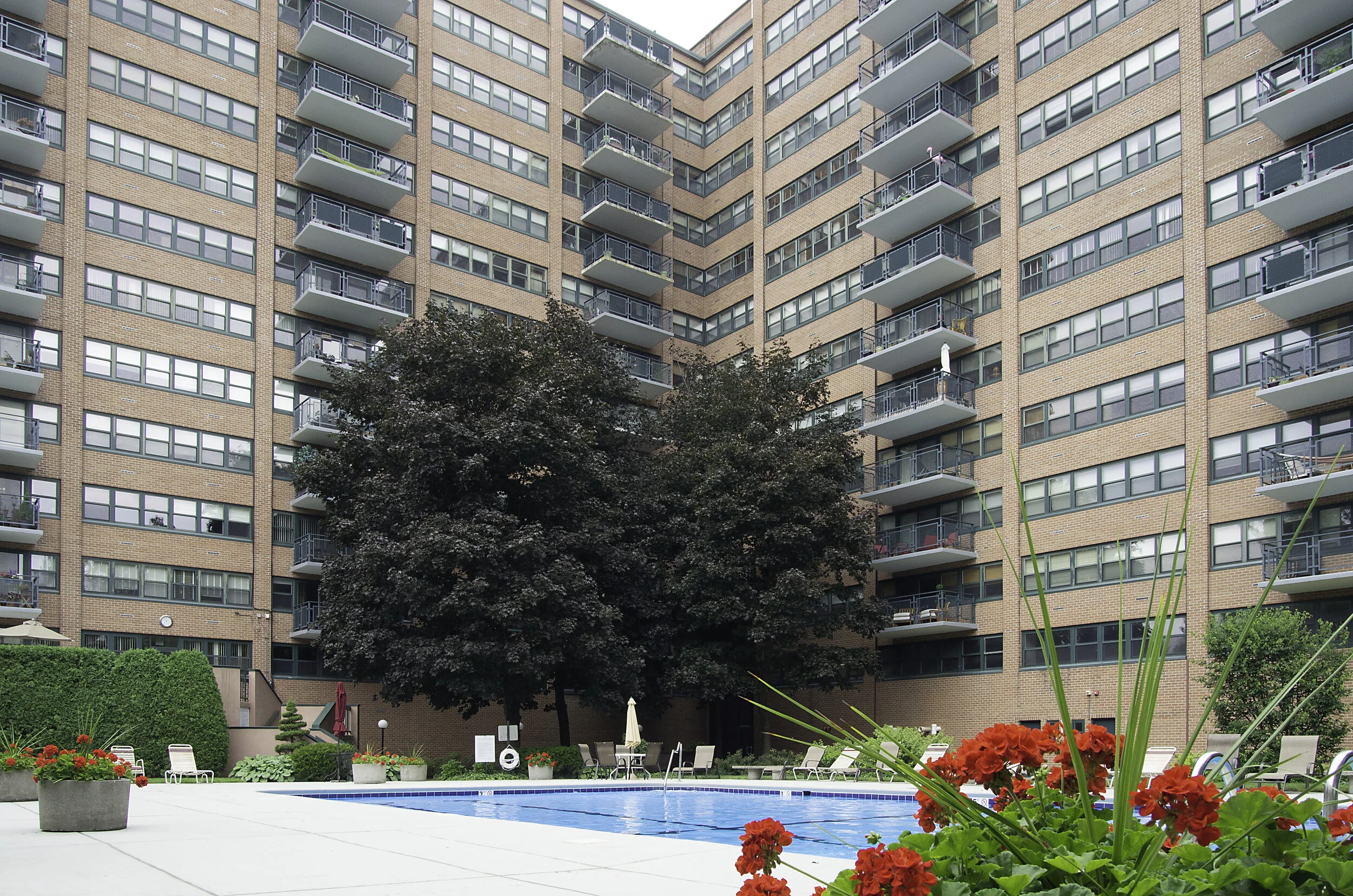 A landscaped urban oasis behind the building, featuring a large pool and patio with lounge chairs, tables with umbrellas, and gazebo